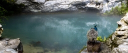 Под лужайкой находилась пещера, и под таким ударом, часть потолка была разрушена. Со временем на этом месте образовалось глубокое озеро, с кристально чистой водой голубого оттенка.