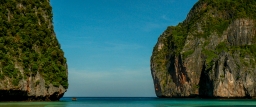 Бухта на островке Пхи-Пхи Лей окружена тремя 100-метровыми скалами. Ее белоснежные пески упираются в густые заросли джунглей, а лазурные воды скрывают под собой роскошные коралловые рифы.