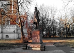 Георгиевский собор. Бронзовая фигура купца в полный рост установлена на гранитном постаменте. Автор памятника Акиму Мальцову - Игорь Черноглазов.