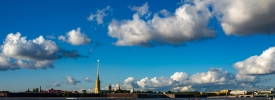 Петроградская сторона — исторический район Санкт-Петербурга, расположенный на островах в северной и северо-западной части дельты реки Невы, административно входящий в состав Петроградского района. Территория является колыбелью города, где 27 мая (16 мая по старому стилю) 1703 года была заложена крепость, изначально получившая название «Санкт-Питер-бурх» на голландский манер, что впоследствии дало имя всему городу. До переименования города императором Николаем II 18 августа 1914 года данная местность именовалась Петербургской стороной. Район характеризуется высокой концентрацией объектов культурного наследия, включая памятники архитектуры стиля модерн и неоклассицизм начала XX века, а также древнейшие постройки начала XVIII века. На изображении представлен панорамный вид на Заячий остров с Петропавловским собором, соединительные мосты и историческую застройку прилегающих территорий.