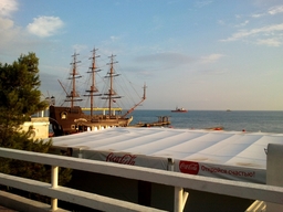 Кафе черноморской кухни со слегка режущим слух названием «Чё? Харчё!» готово накормить праздно прогуливающихся туристов вкусными блюдами и освежающими напитками. И таких кафе и ресторанов вдоль набережной множество. С таким же разнообразием цен и набором блюд. Главное внимательно смотреть не только под ноги, но и поднимать голову вверх.