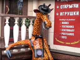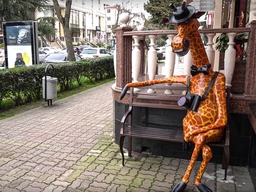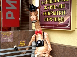На улице Воровского в доме № 22 расположилась фото-студия где на скамейке сидит жираф с фотоаппаратом. Скульптура называется