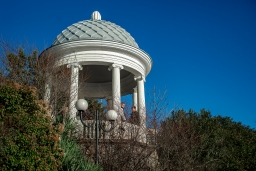 - Форма и стиль: Беседка имеет округлую форму, увенчанную светлым куполом. Ее поддерживают 8 белых колонн ионического ордера, которые придают сооружению легкость и изящество.