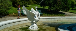 - На фонтане изображены ключевые персонажи сказки: князь Гвидон, белка с золотыми орехами, Черномор, тридцать три богатыря, корабль с парусами, лебеди и, конечно, Царевна-Лебедь. Фигура Царевны-Лебедь достигает 4 метров в высоту.